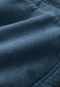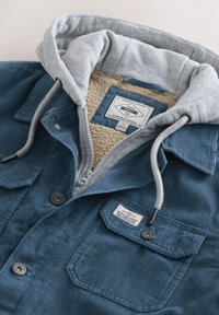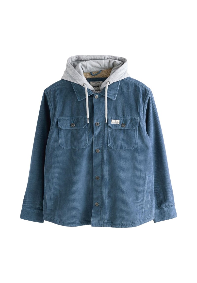 Veste en velours côtelé bleu avec fermeture à boutons, deux poches poitrine et capuche gris clair attachée avec cordons.