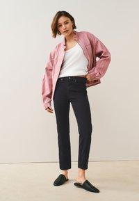 Femme portant un jean droit noir, un haut blanc, une veste rose et des chaussures noires sans lacets, debout les mains ajustant la veste.