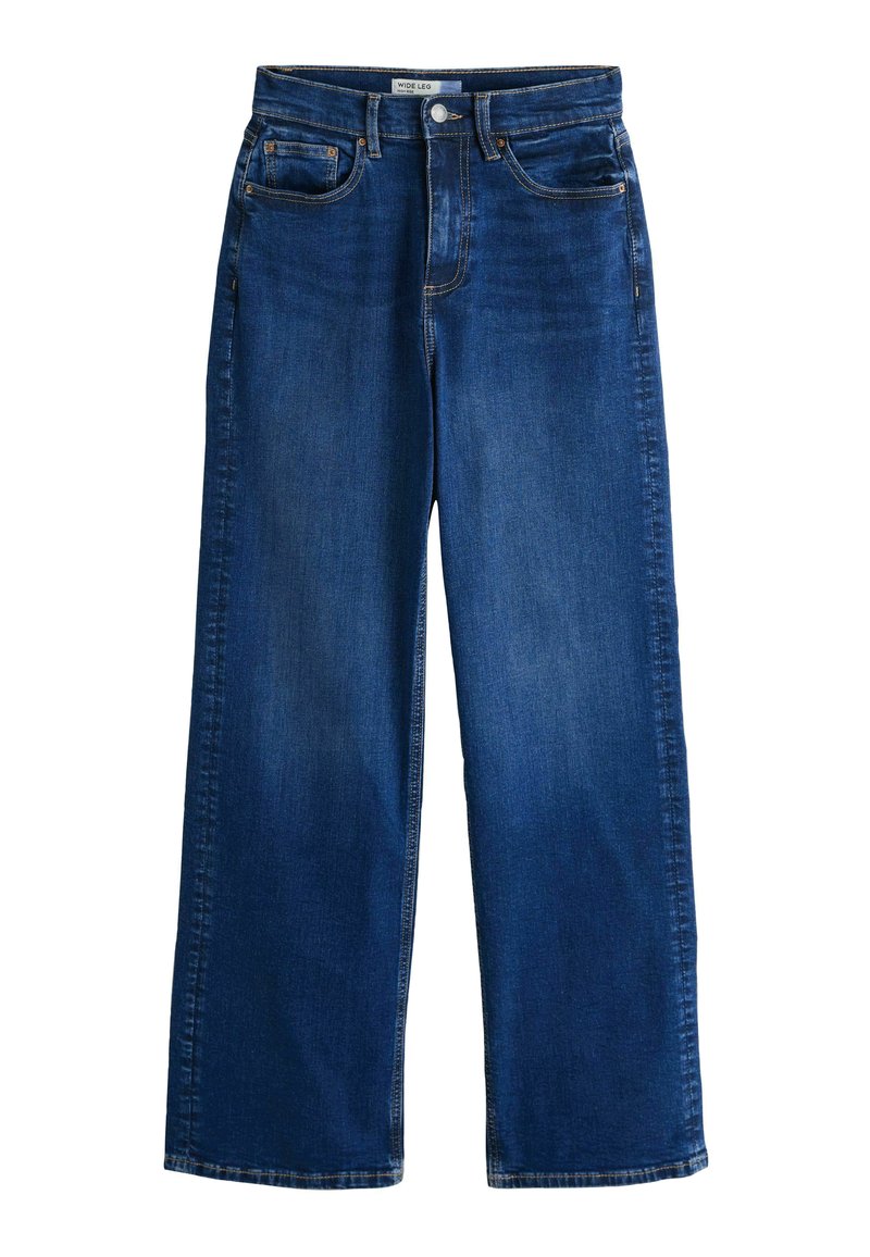 Jean large bleu foncé avec poches avant et arrière, fermeture par bouton et fermeture éclair, et surpiqûres contrastantes.