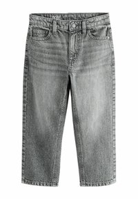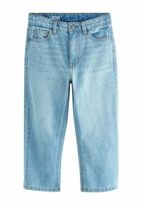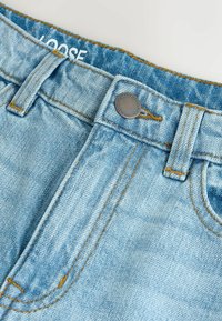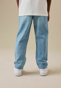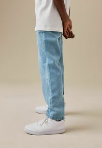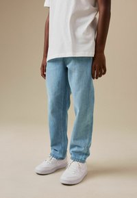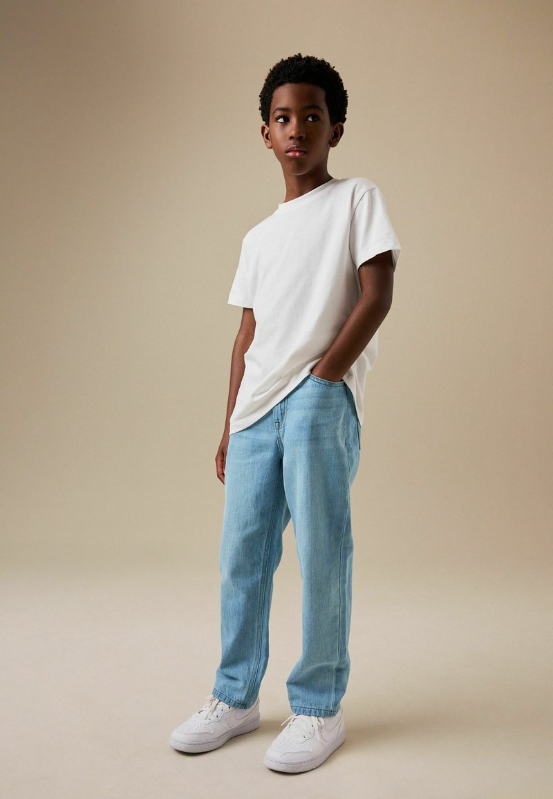 Garçon debout, une main dans la poche, portant un t-shirt blanc, un jean bleu clair et des baskets blanches sur un fond beige uni.