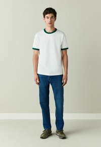 Homme portant un jean droit bleu et des baskets vertes, debout devant un fond clair uni.