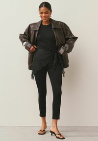 Femme portant un pantalon noir ajusté avec des fentes aux chevilles, un débardeur noir, une veste en cuir marron et des sandales noires à lanières, debout devant un fond neutre.