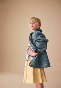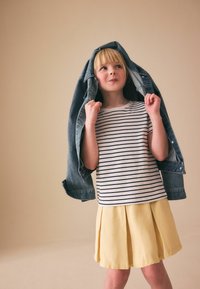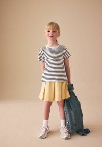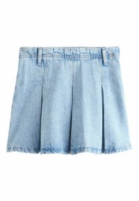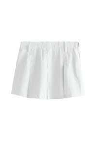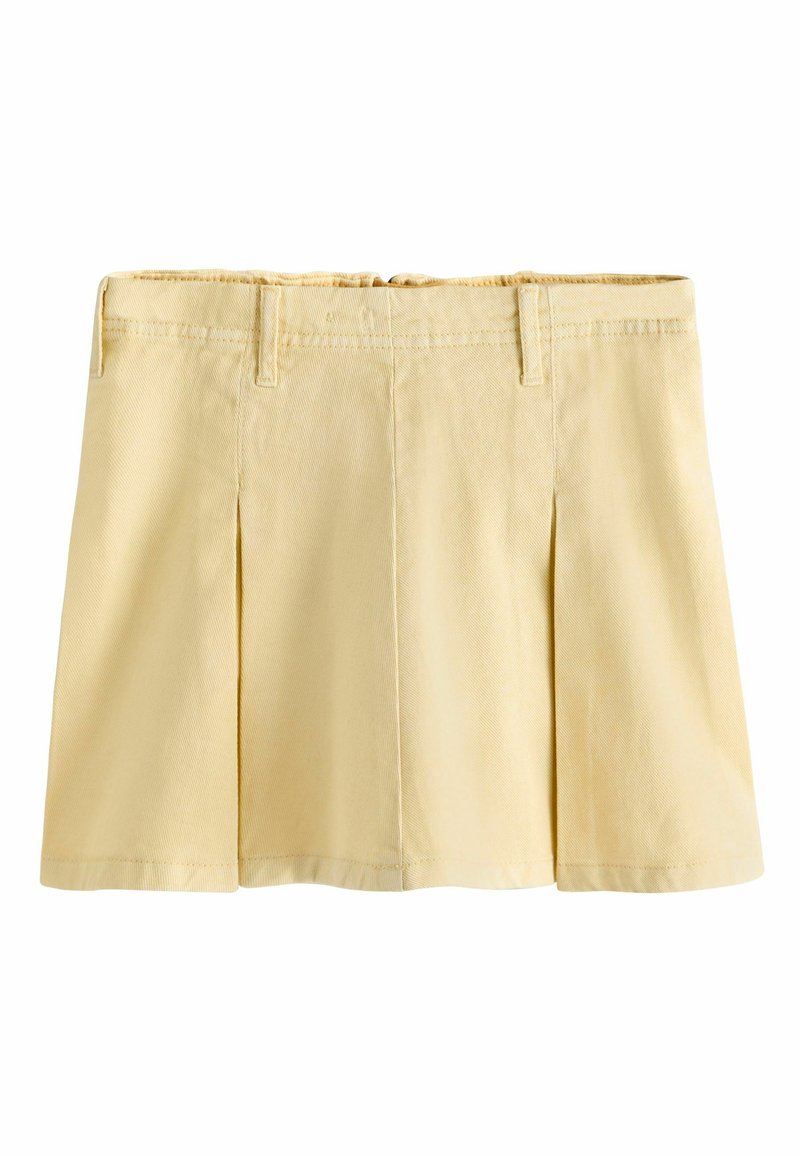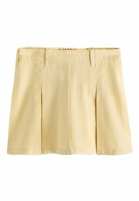 Mini-jupe plissée beige clair avec passants pour ceinture, en tissu texturé, présentée à plat sur un fond blanc.