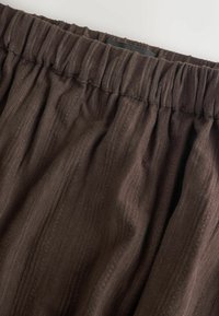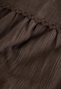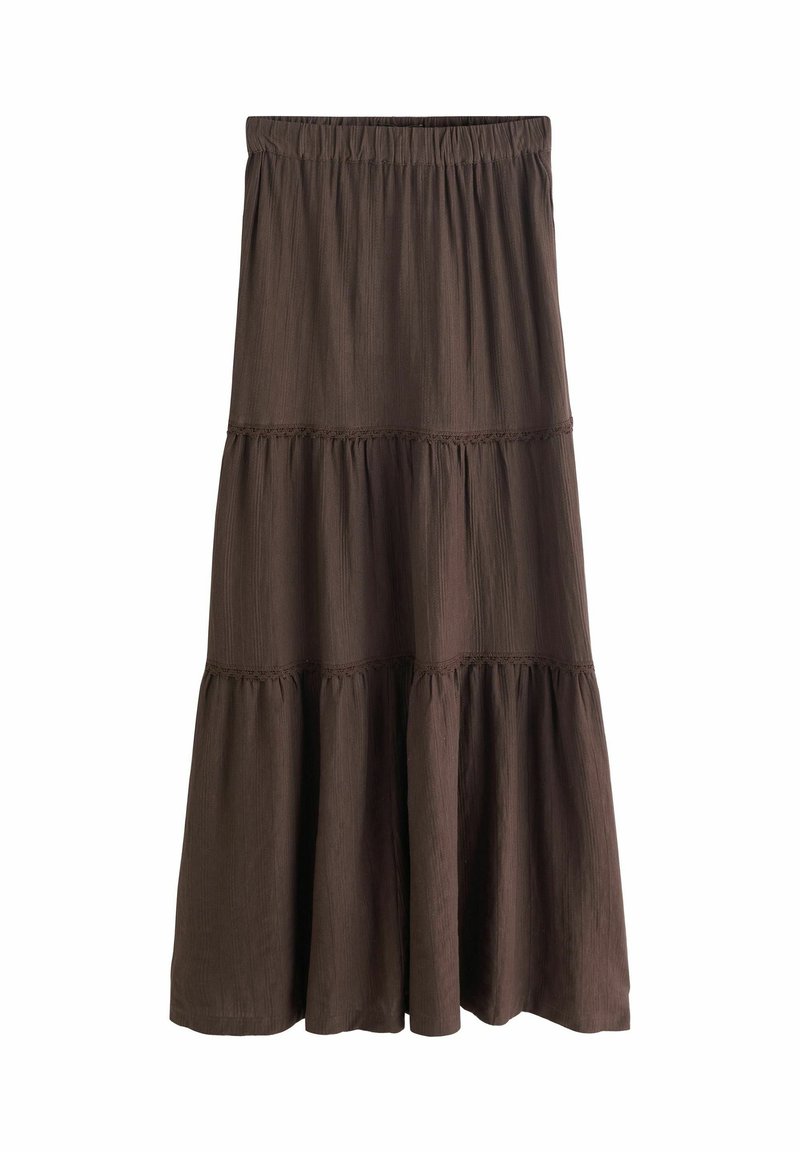 Jupe longue marron à volants avec ceinture élastique et tissu subtilement texturé, présentant trois coutures horizontales froncées.