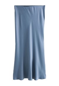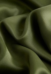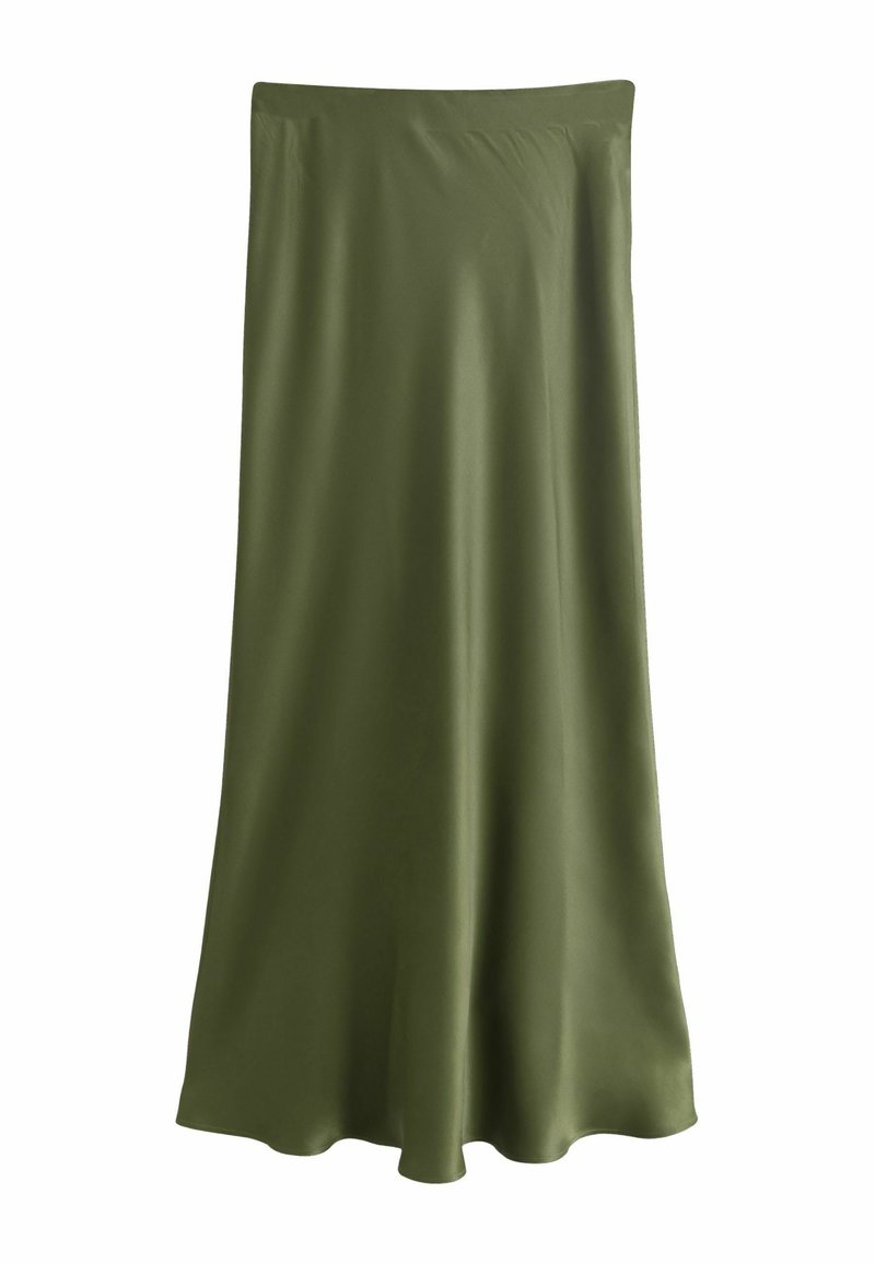 Jupe longue satinée vert olive avec une silhouette fluide. Texture lisse, sans motifs visibles, et taille élastique en haut.