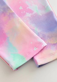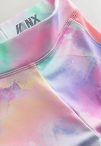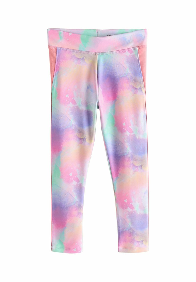 Leggings pour enfants imprimés en aquarelle pastel avec panneaux latéraux en mesh rose et une large ceinture.