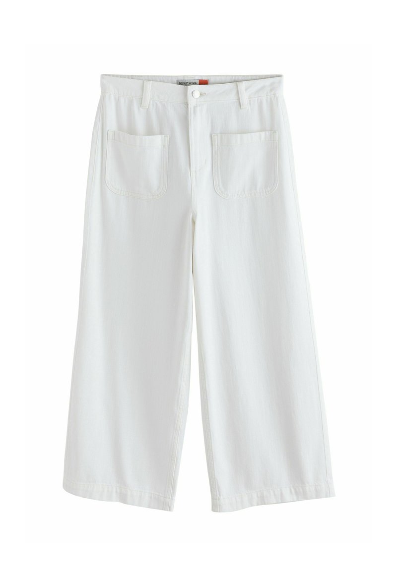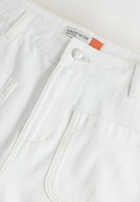 Pantalon blanc large et court avec poches plaquées à l'avant, passants pour ceinture et fermeture à bouton à la taille.