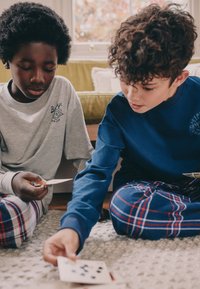 Deux garçons en pantalon de pyjama à carreaux et hauts à manches longues se tiennent dans un salon, l’un pieds nus, l’autre portant des chaussons bleu marine.