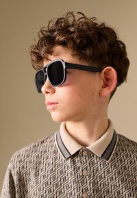Garçon aux cheveux bouclés portant de grandes lunettes de soleil noires et une chemise beige à motifs avec col, faisant face vers l'avant avec une expression neutre.