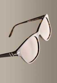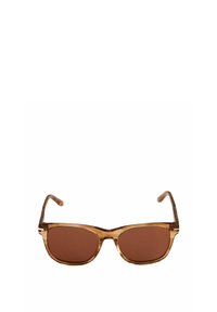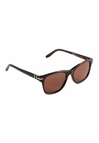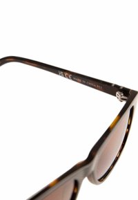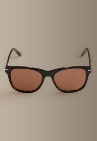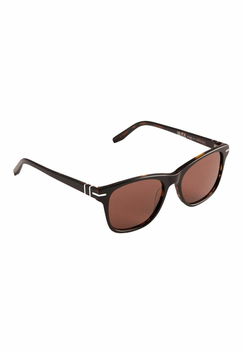 Lunettes de soleil rectangulaires teintées de brun avec une monture en écaille de tortue foncée et des accents argentés sur les branches, présentées en angle sur un fond blanc.