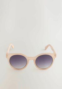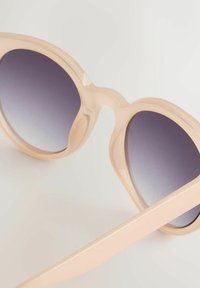 Lunettes de soleil rondes avec une monture beige clair et des verres dégradés foncés. Texture lisse avec des branches fines et courbées. Aucun élément visible de quincaillerie ou d'ornement.