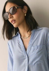 Lunettes de soleil écaille avec des verres foncés et un accent doré sur la charnière, associées à un collier chaîne doré et une chemise à rayures bleues.