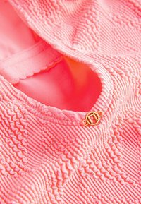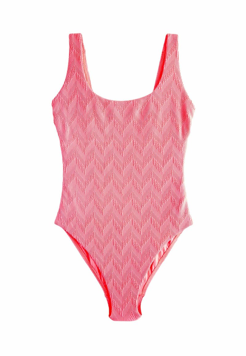 Maillot de bain une pièce rose vif avec un motif en zigzag texturé, doté de larges bretelles et d'une coupe haute à la jambe.
