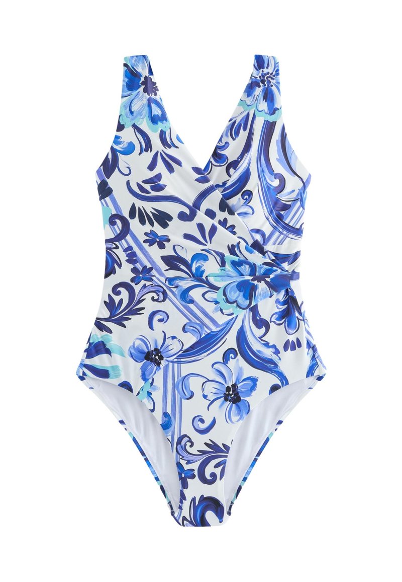 Maillot de bain une pièce blanc avec des motifs floraux et tourbillonnants bleus et turquoise, avec un devant style cache-cœur et des bretelles larges.