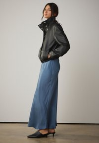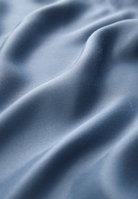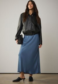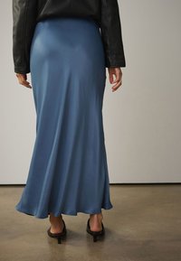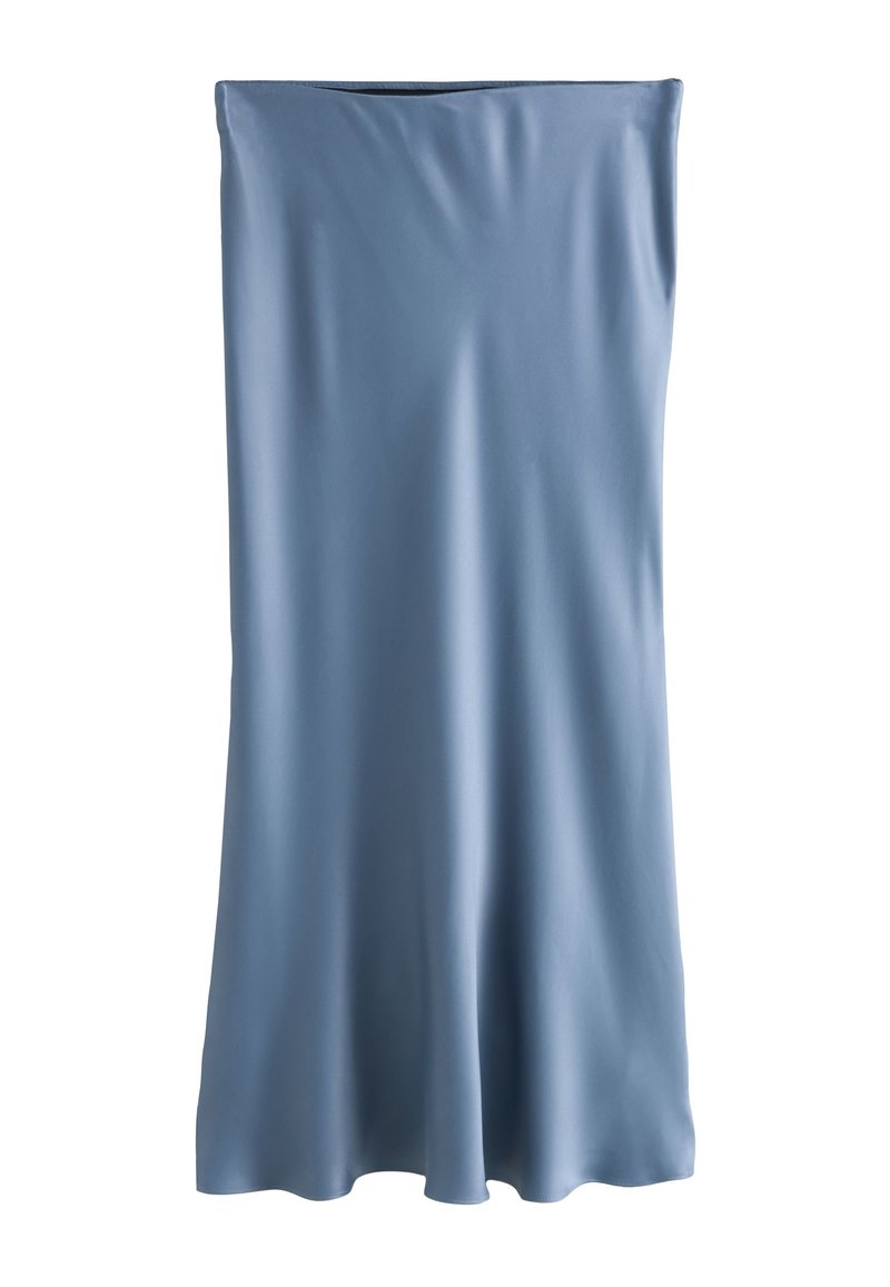 Jupe midi en satin bleu clair avec une texture lisse et un ourlet légèrement évasé sur fond blanc.