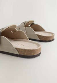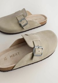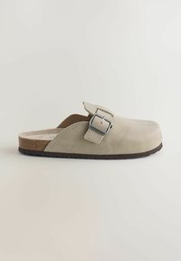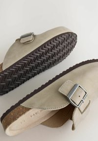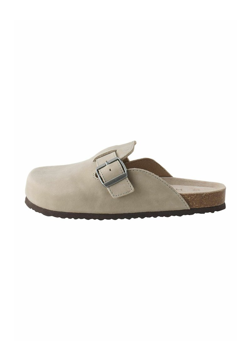 Chaussure beige en daim à enfiler avec un bout arrondi, une bride ajustable avec une boucle argentée, et une semelle intérieure en liège ; semelle extérieure en caoutchouc texturé.