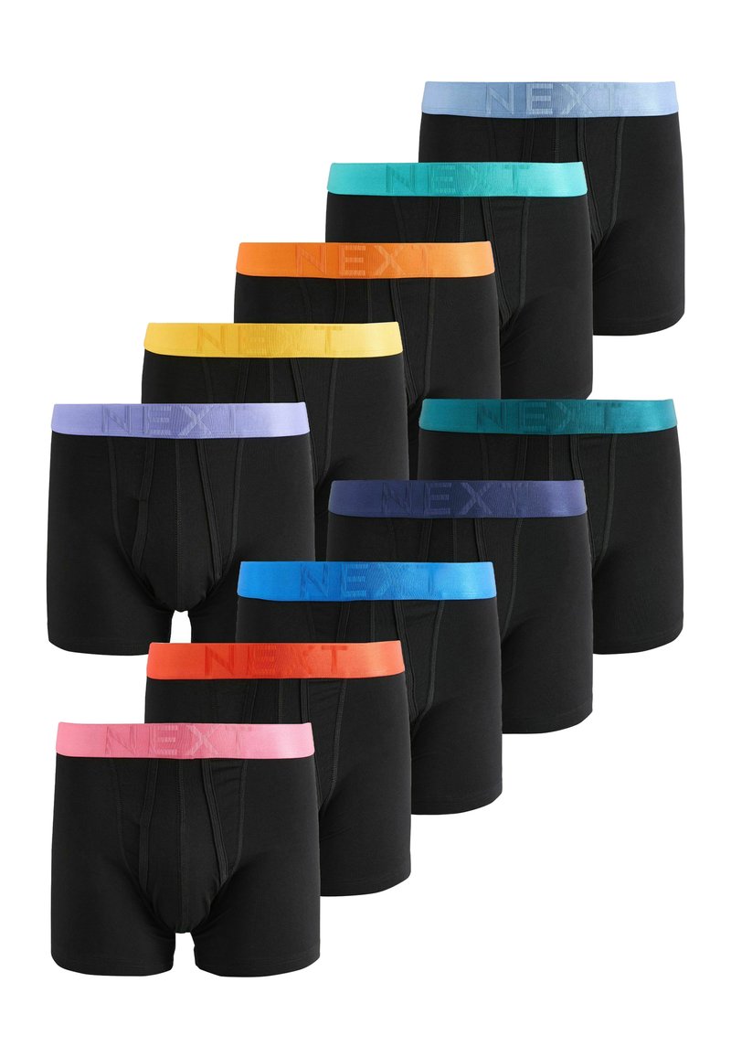Dix boxers noirs avec tailles élastiques de différentes couleurs : bleu clair, sarcelle, orange, jaune, violet, marine, bleu, rouge, rose.
