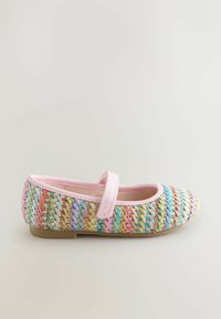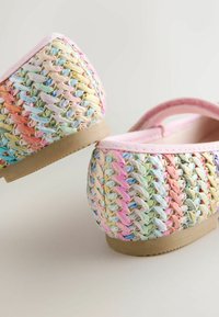 Chaussure plate Mary Jane pour enfants avec dessus tissé multicolore pastel, bride et finitions roses, semelle plate en caoutchouc.