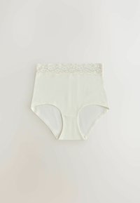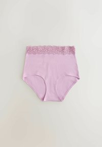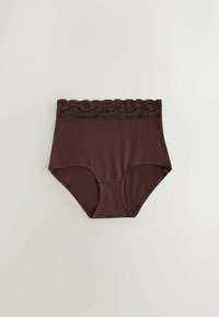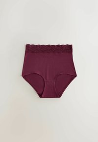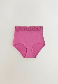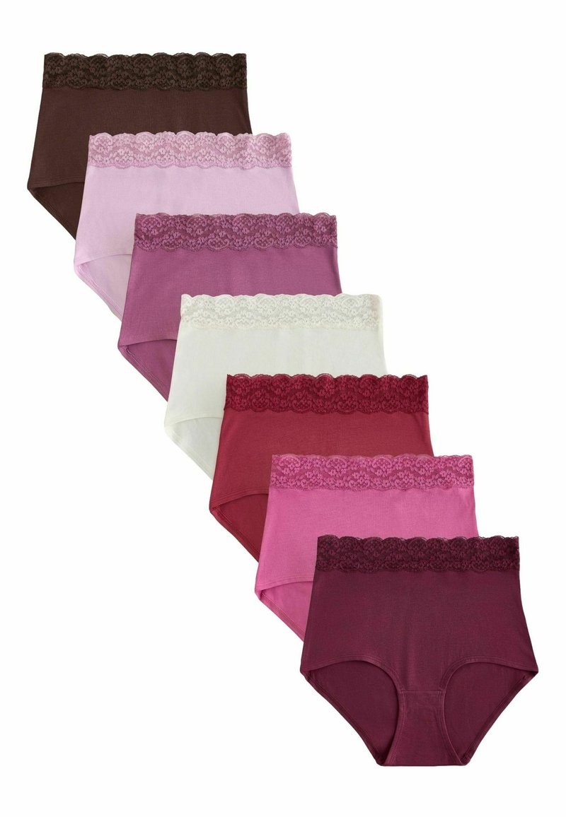 Sept paires de sous-vêtements pour femmes taille haute dans des nuances de rose, rouge, crème et marron, chacune avec une taille en dentelle.