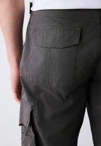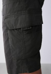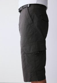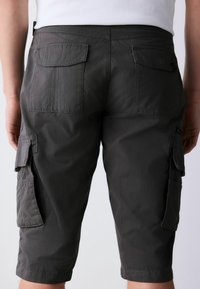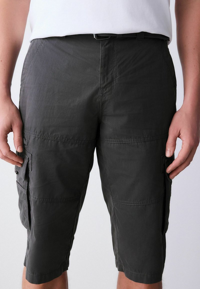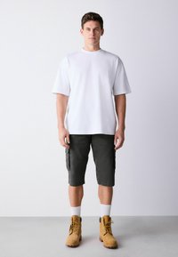 Homme portant un short cargo noir avec poches latérales et une chemise blanche, debout les mains détendues le long du corps.