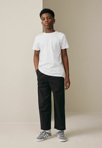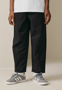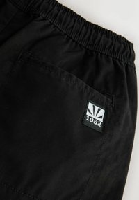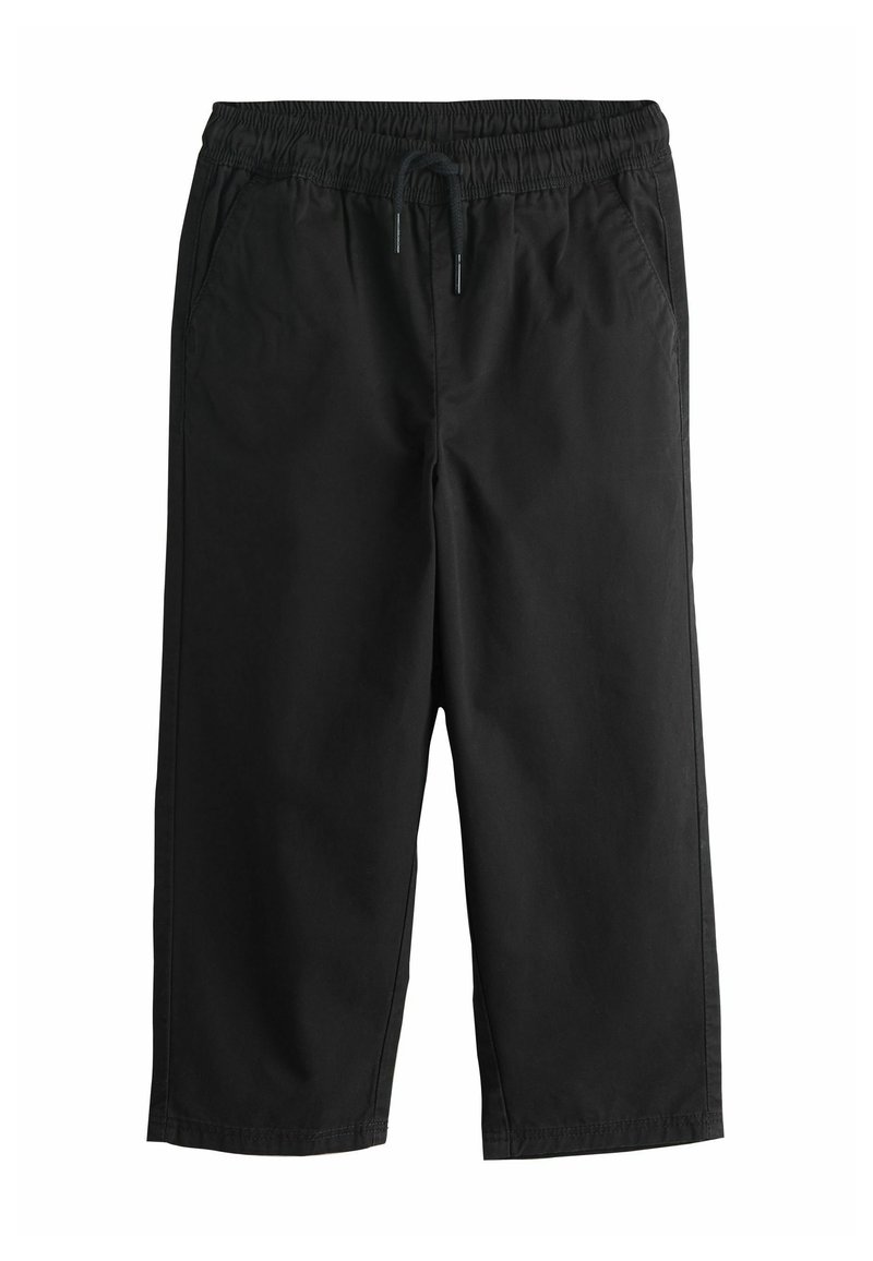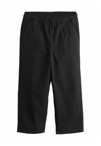 Pantalon noir raccourci en tissu léger, doté d'une taille élastique avec cordon de serrage ajustable et poches latérales. Design simple.