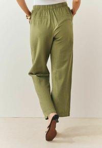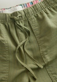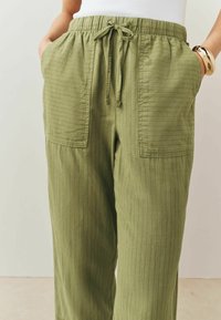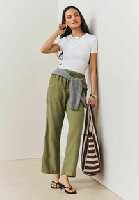 Personne portant un pantalon ample vert olive avec de grandes poches avant, un haut blanc, des sandales à talons noires et un large bracelet au poignet droit.