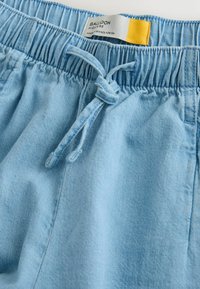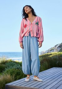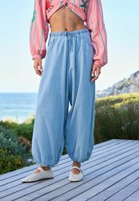 Personne portant un pantalon ample bleu clair avec des poignets élastiques, des chaussures blanches perforées et un haut à motif floral rose, debout sur une terrasse en bois près de l'océan.