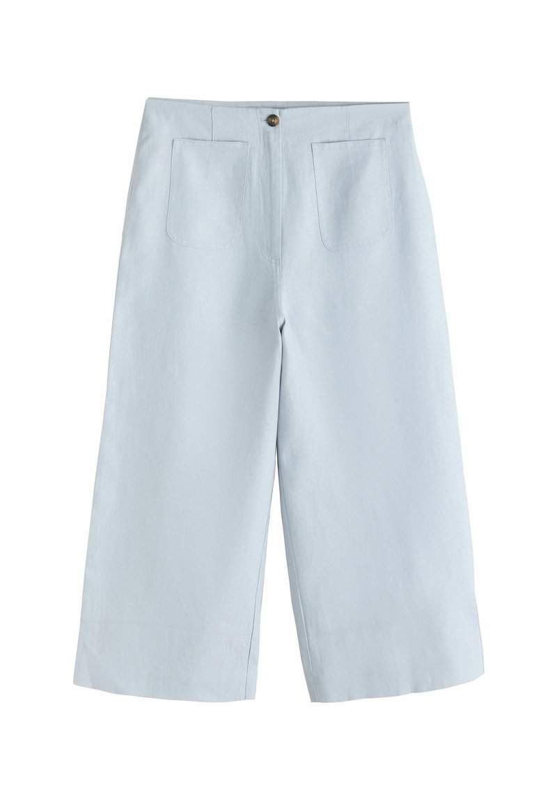 Pantalon large bleu clair raccourci avec poches plaquées à l'avant et une fermeture par un seul bouton à la taille.