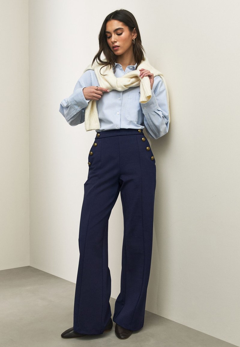 Femme portant une chemise rayée bleu clair, un pantalon taille haute bleu marine avec des boutons dorés, des chaussures noires et un pull crème posé sur les épaules.