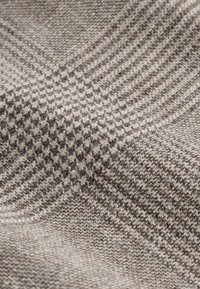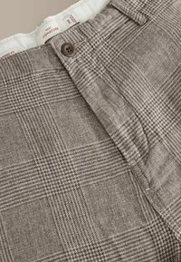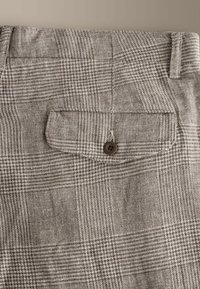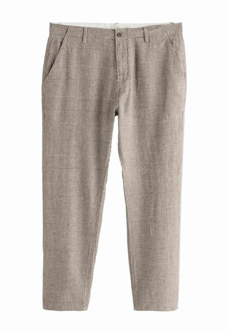 Pantalon beige pour homme, coupe slim, avec un motif à carreaux subtil, poches latérales, passants pour ceinture, et une fermeture boutonnée à la taille.