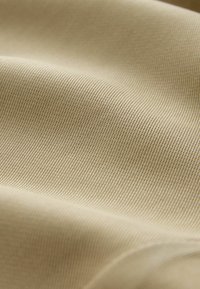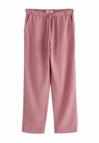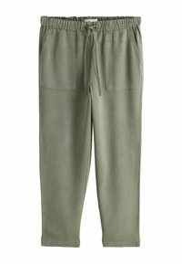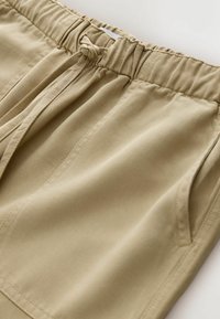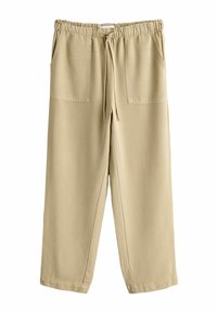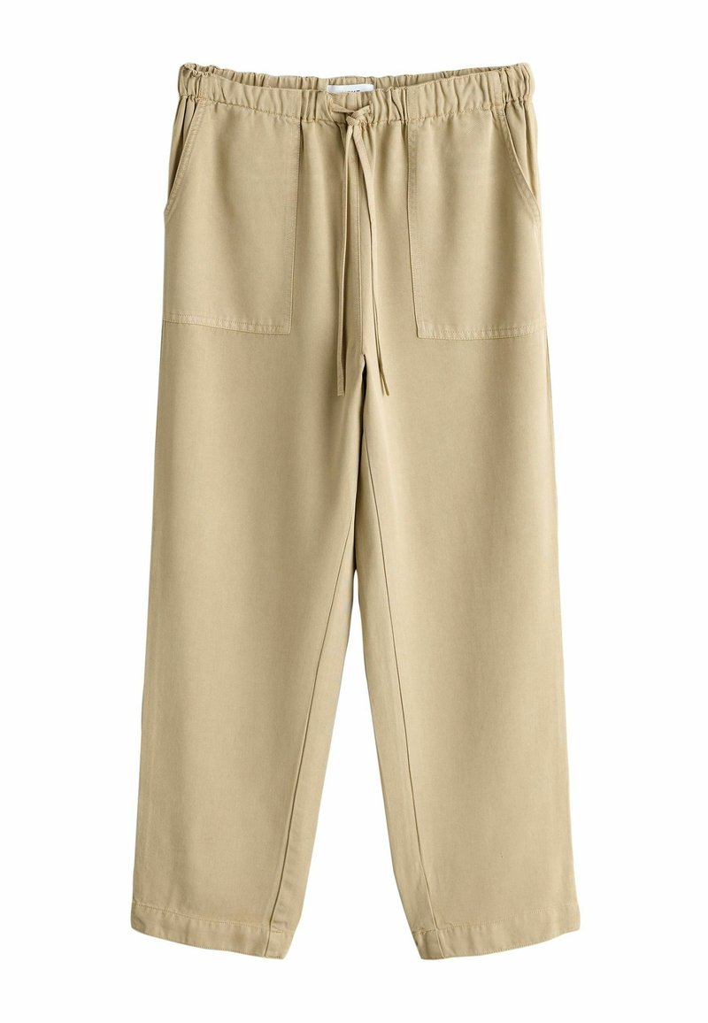 Pantalon beige décontracté avec taille élastique, cordon de serrage, et deux poches plaquées à l'avant, présenté sur un fond blanc.