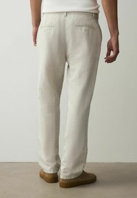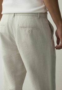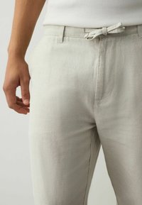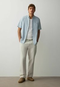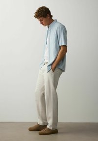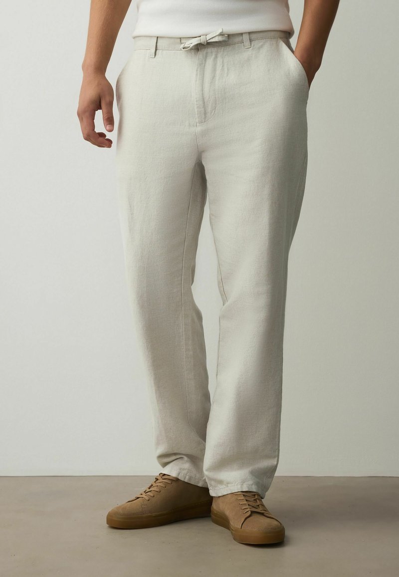 Personne portant un pantalon en lin beige clair avec des poches latérales et des baskets montantes couleur fauve, debout sur un sol gris devant un mur uni.