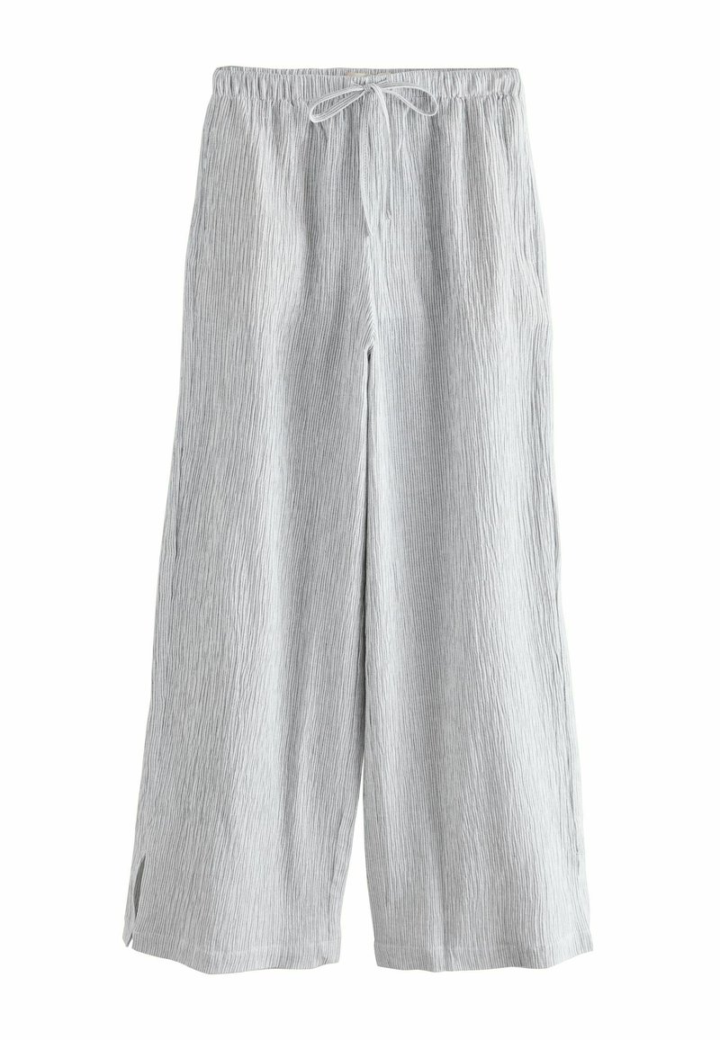 Pantalon large à rayures grises avec taille élastique, cordon de serrage, fentes latérales et tissu texturé.