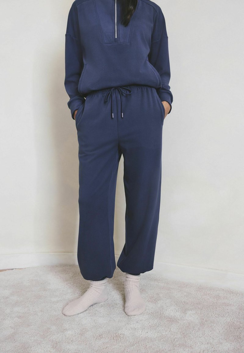 Sweat-shirt bleu marine et joggers assortis en tissu doux, avec une fermeture à glissière sur le devant, des poches latérales et une ceinture élastique.
