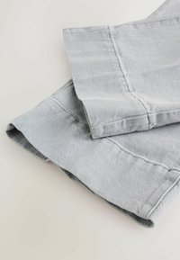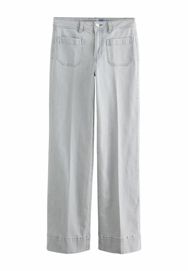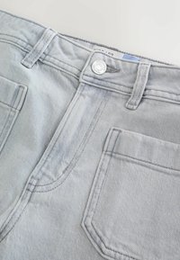 Jean gris clair à jambes larges avec poches plaquées avant, passants de ceinture, fermeture par bouton et ourlets retroussés.