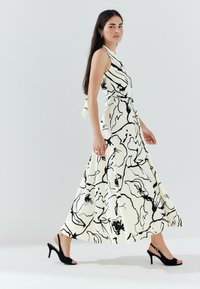 Femme portant une robe maxi blanche sans manches avec des motifs floraux abstraits noirs, associée à des talons ouverts noirs, debout devant un fond uni.