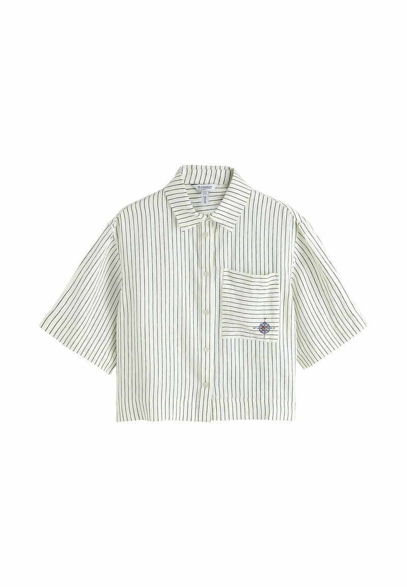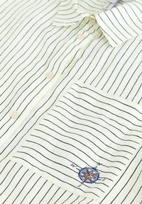 Chemise blanche à manches courtes avec des rayures verticales fines noires et une poche avant brodée d'un petit motif de boussole.