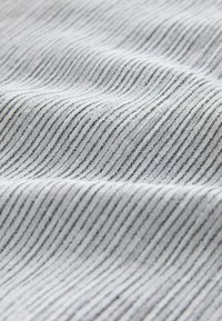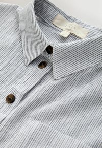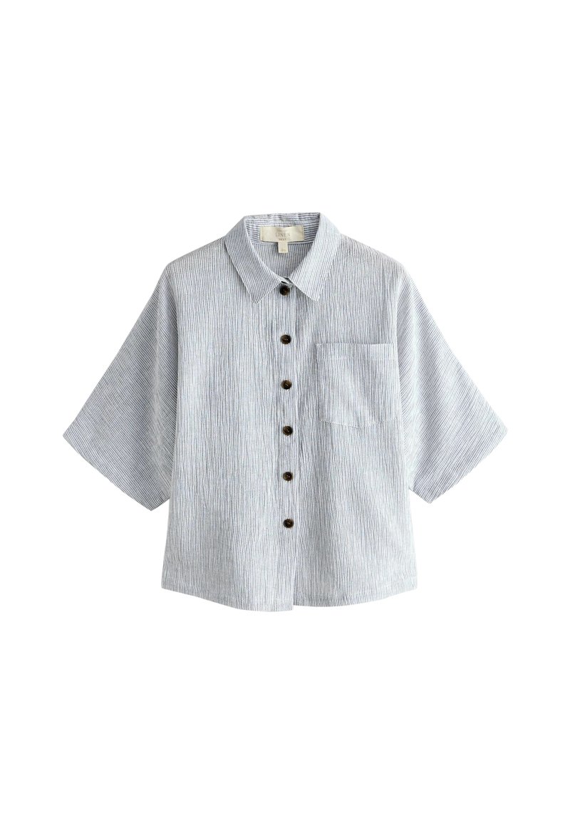 Chemise à manches courtes gris clair avec fines rayures verticales, une poche poitrine avant, et des boutons ronds foncés.
