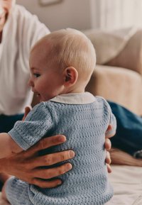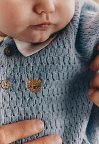 Ensemble tricoté bleu clair composé d'un polo à manches courtes avec un col blanc, des boutons en bois, et un short assorti.