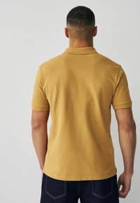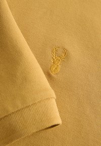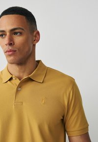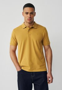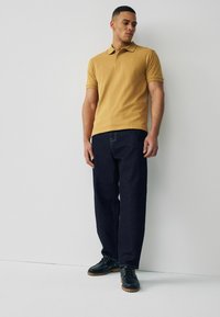 Jeune homme portant un polo jaune moutarde et un jean bleu foncé, debout devant un fond uni gris clair.
