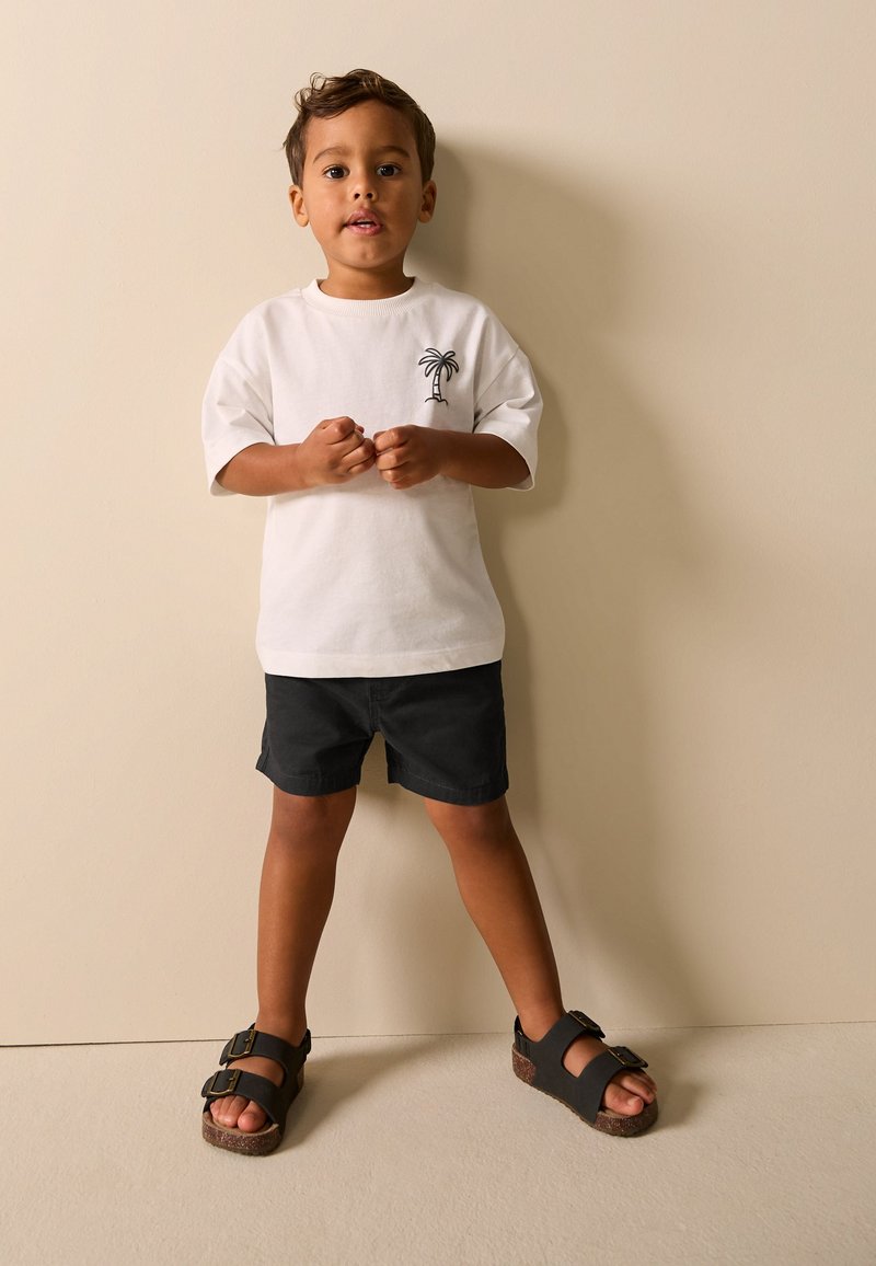 Jeune garçon debout contre un mur beige, portant un t-shirt blanc avec un motif de palmier, un short noir et des sandales noires à boucles.