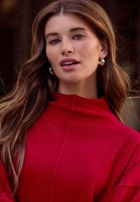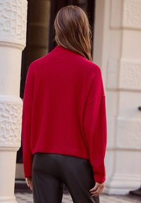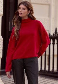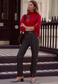 Femme debout sur des marches extérieures portant un pull rouge à manches longues, un pantalon en cuir noir, des talons nus, et tenant un sac à bandoulière marron.
