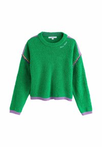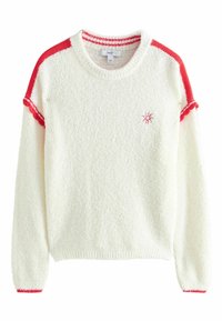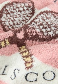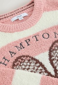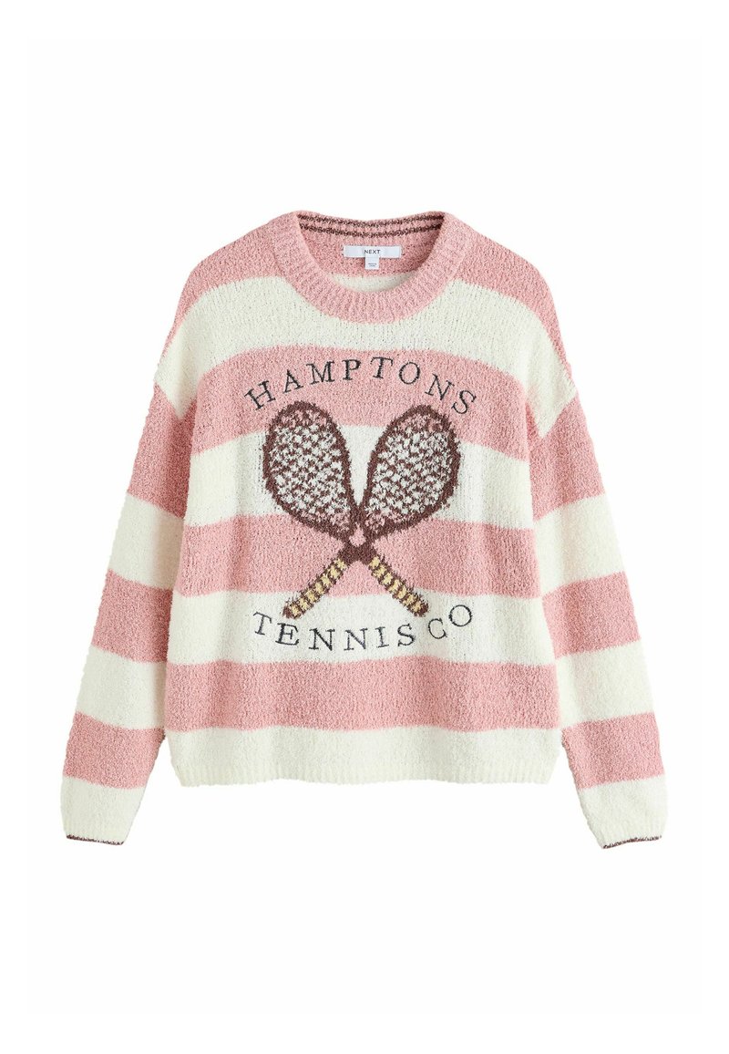 Pull tricoté rayé rose et blanc avec des raquettes de tennis croisées et le texte "Hamptons Tennis Co" sur le devant.