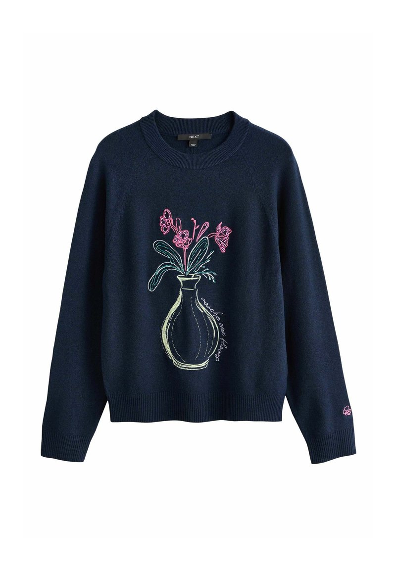Pull bleu marine avec broderie de vase floral en rose et vert. Col rond, ourlet et poignets côtelés, texture douce, coupe décontractée.