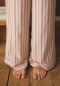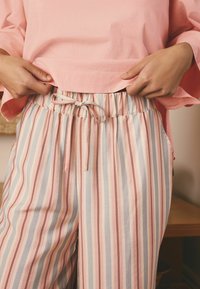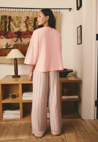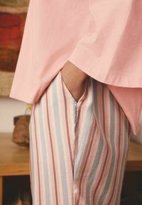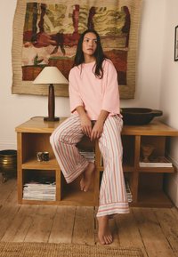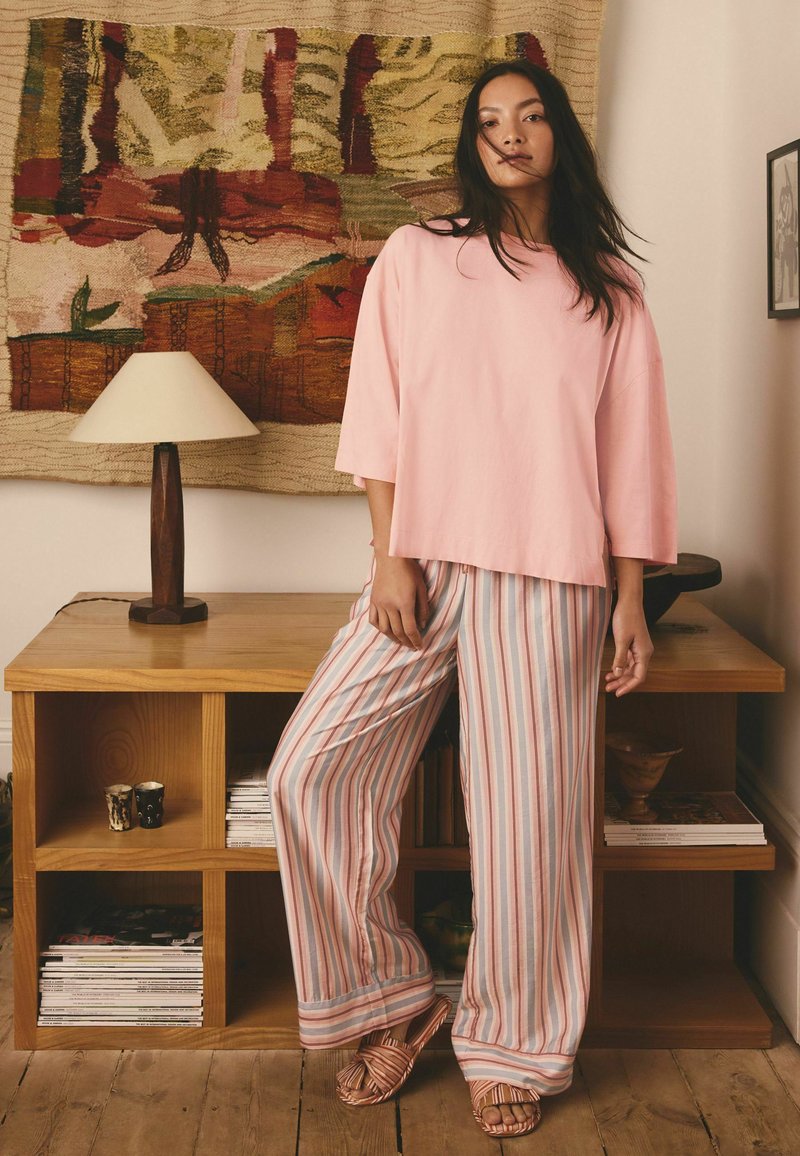 Femme debout à l'intérieur, portant un haut rose ample et un pantalon large à rayures, avec des sandales, devant une étagère en bois et une tenture murale abstraite.