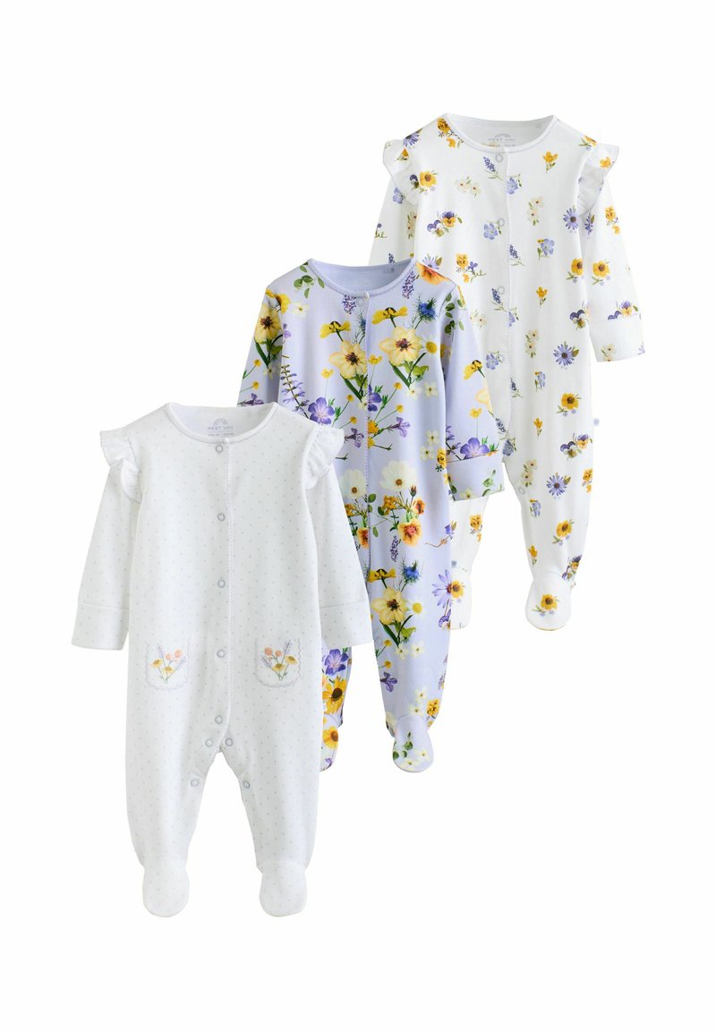 Trois grenouillères pour bébé à manches longues avec pieds et boutons-pression à l'avant ; une blanche avec de petites fleurs et des poches, une lavande avec des fleurs jaunes, et une blanche avec des imprimés floraux épars.