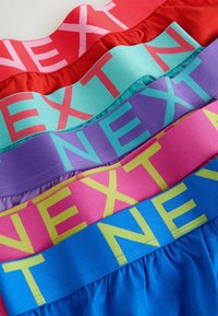 Cinq paires de boxers aux couleurs vives : rouge, turquoise, violet, rose et bleu. Chaque modèle est doté d'une ceinture élastique assortie avec le logo "NEXT".