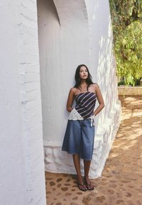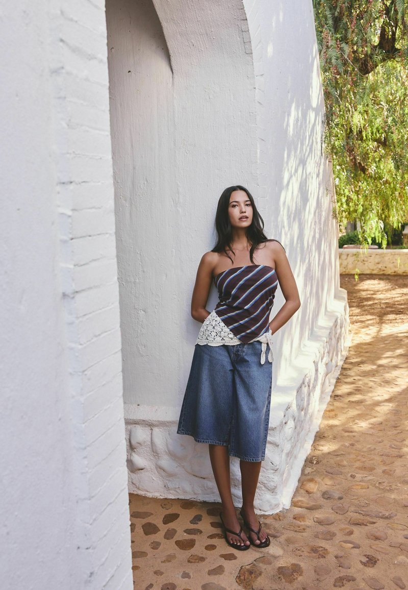 Femme en haut rayé sans bretelles et culottes en denim, debout contre un mur blanc texturé sur un chemin pavé avec de la verdure à proximité.