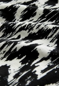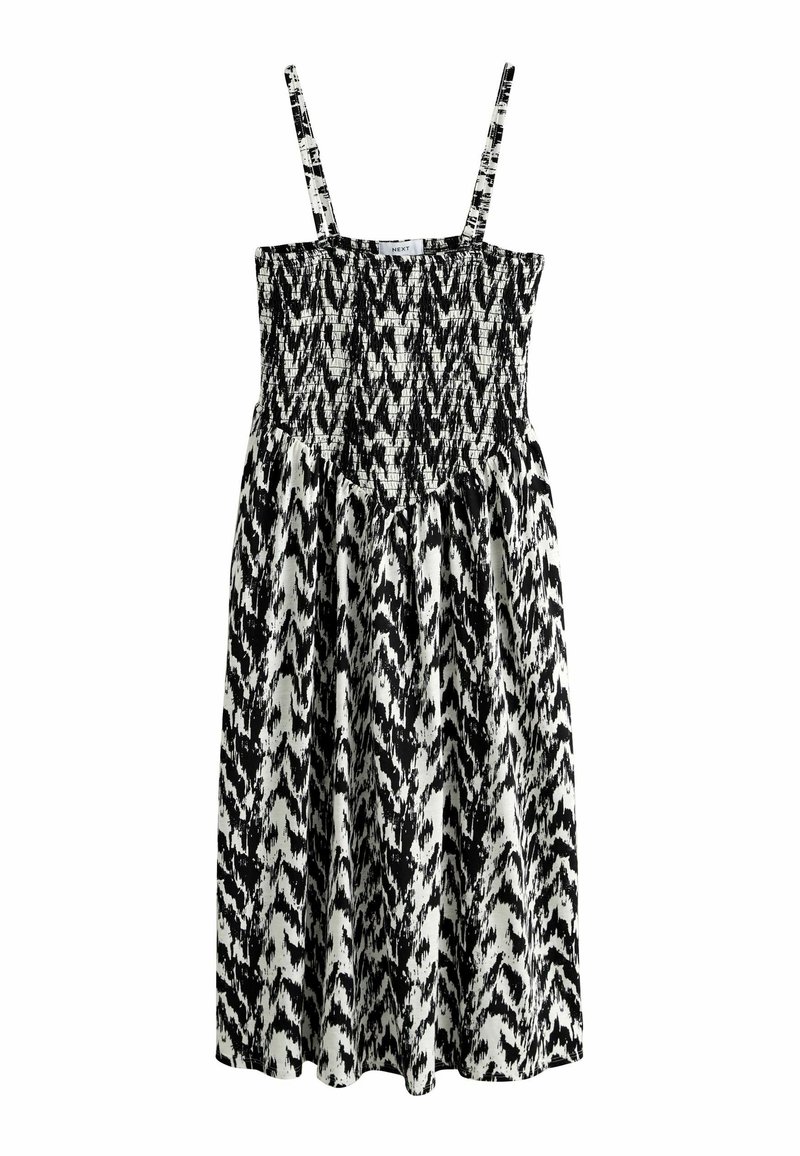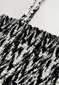 Robe à motifs noirs et blancs avec corsage smocké, bretelles fines et jupe fluide. Fabriquée dans un tissu léger avec une finition texturée.