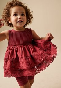 Tout-petit aux cheveux bouclés portant une robe sans manches bordeaux à volants et un short assorti, regardant vers la droite sur un fond uni.